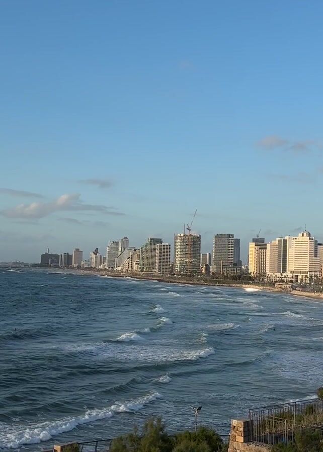 wide shot of a beach and cityscape. The sky is blue with a few scattered clouds. The ocean is a deep blue-green color, with waves rolling towards the shore. In the distance, a skyline of tall buildings can be seen, some of which appear to be under construction with visible cranes. The beach is sandy and stretches along the coastline. There is a stone wall and some greenery in the foreground, slightly obscuring the view of the beach. The overall scene is bathed in sunlight, creating a bright and airy atmosphere.