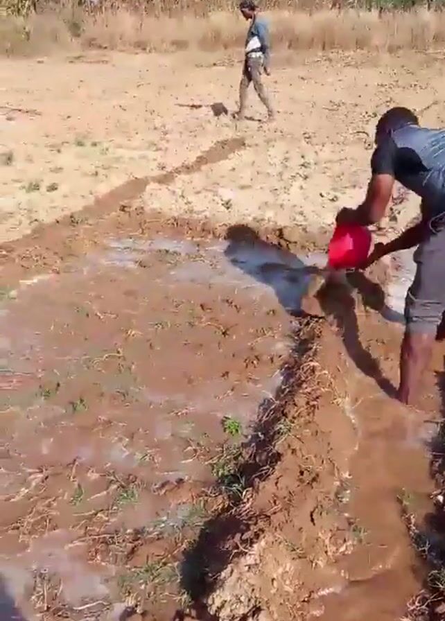 two men irrigating a field. One man is walking across the field. The other man is bending over in a trench and pouring water from a red bucket. The irrigation is manual. The field is comprised of dirt ridges and furrows, with pools of water between the ridges. There is a tree in the background. Other rural buildings are visible in the distance.