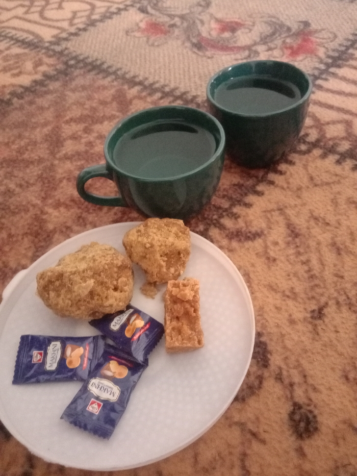 The scene is located in Quetta City Tehsil, Pakistan. An indoor setting displays a light brown carpet adorned with darker, intricate patterned designs. Two dark teal ceramic mugs, each containing a dark liquid, are positioned on the carpet. In the foreground, a white, circular plastic plate holds three dark blue packets of "MAKHANI" branded snacks, accompanied by three pieces of light brown, crumbly confectioneries; two are irregularly shaped masses, and one is a rectangular bar. No individuals are present, but the arrangement indicates a prepared serving.