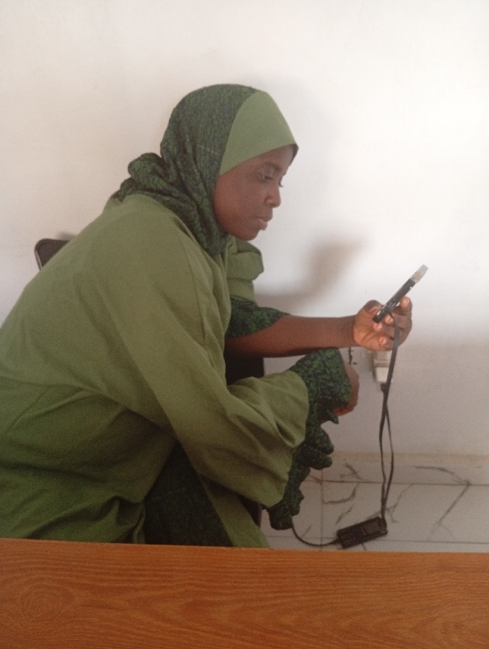 A woman wearing a green headscarf and matching robe is seated, looking at a black smartphone she holds in her right hand