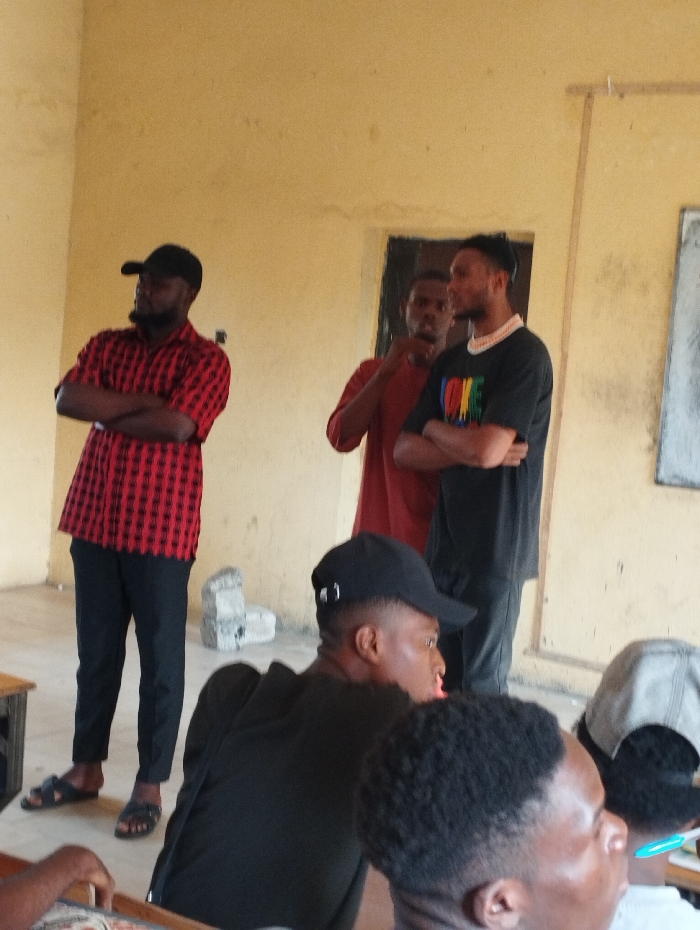 Several people are in a room with yellow walls. A man in a red and black checkered shirt, black pants, and sandals stands with his arms crossed, wearing a black cap. Two other men stand nearby, one in a red shirt and another in a black t-shirt with colorful writing. In the foreground, seated individuals are visible, some wearing black caps, their faces partially obscured. A door and a blackboard are visible in the background. The setting appears informal, possibly a classroom or meeting space.
