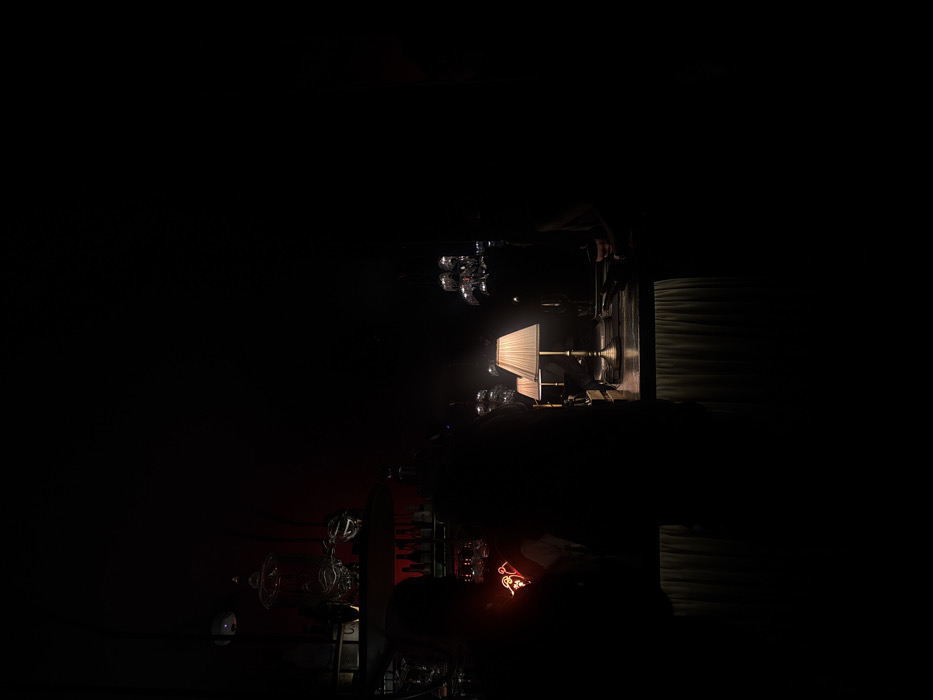 A dimly lit room contains a dresser illuminated by two lamps. Wine glasses are placed on the dresser's surface and a curtain is positioned to the right of the dresser. Below the dresser, a shelf displays more wine glasses and a neon sign. The scene is characterized by low light conditions, with the lamp and neon sign serving as the primary sources of illumination.