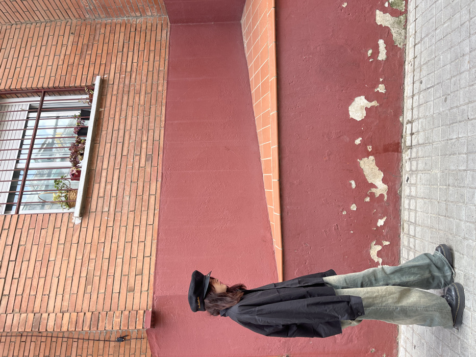 An individual walks left-to-right on a grey tiled sidewalk, adjacent to a building wall in Barcelona, Spain. The wall features an upper section of red-orange brickwork and a lower section painted reddish-brown, which shows extensive paint peeling and discoloration at its base. A rectangular window, set within the brick, has a white frame, horizontal security bars, and a white ledge supporting multiple potted plants of varying foliage and a woven basket. Below the window, an elevated architectural element topped with small, square terracotta tiles and a rounded edge creates a diagonal transition to the lower painted wall. The person, seen in profile, wears a black peaked cap with faint gold embroidery, exposing medium-length brown hair. Their attire includes a loose black long-sleeved shirt or jacket, wide-leg faded green/grey jeans, and black platform shoes.