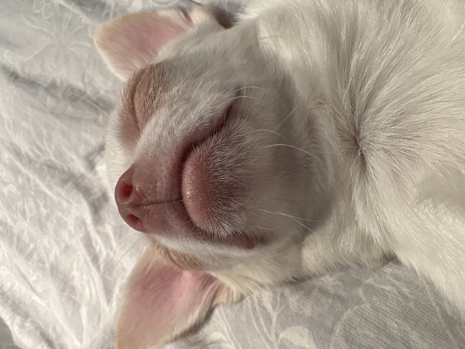 - "A close-up reveals a sleeping white Chihuahua, its head resting on a wrinkled white surface" by FM-08PzB2, licensed under CC BY 4.0