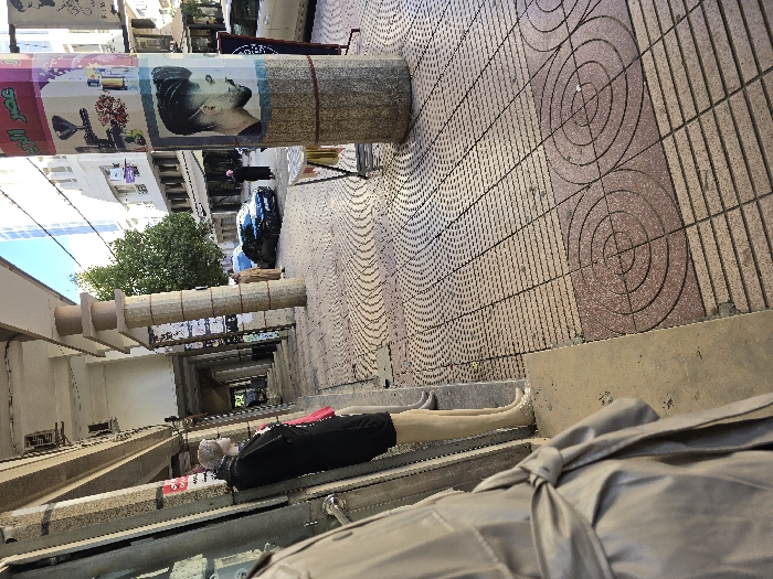 This image depicts an urban street scene in Taza, Morocco, under bright daylight. The foreground on the left shows the back of a mannequin dressed in a beige trench coat, tied at the waist. To its right, another mannequin, partially visible behind a storefront, wears a black top and displays bare, light-toned legs. The sidewalk, a central feature, is paved with distinct patterns: reddish-brown tiles with concentric circles interspersed with lighter-toned tiles featuring linear and curvilinear designs. Several multi-segment concrete columns support an overhead concrete structure, forming a covered walkway. The closest column on the right is heavily adorned with various posters, including a prominent advertisement for a barber shop featuring a man with a modern haircut, and other posters with Arabic text and product imagery. A small, light-colored display stand with a draped fabric is situated adjacent to this column. Further into the midground, a paved street runs parallel to the sidewalk. A dark-colored sedan is parked on this street. Two individuals are present: one person, dressed in a light-brown traditional Moroccan garment (Djellaba), stands near the parked car. Another person, clad in dark clothing and a head covering, walks away from the camera further down the street. The background reveals a series of multi-story buildings lining the street. A tall, modern building with reflective windows is visible in the distance. A green tree provides foliage, and overhead utility lines traverse the scene.