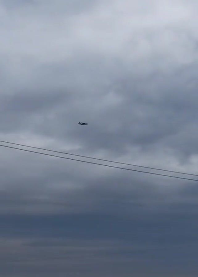 n airplane flying in a cloudy sky above a city. The plane appears dark against the overcast sky. Two parallel power lines stretch horizontally across the middle of the frame, slightly obscuring the plane's path. In the background, a city skyline is visible, with a dense forest area in front of it. The overall mood is somewhat somber due to the gray, cloudy weather.
