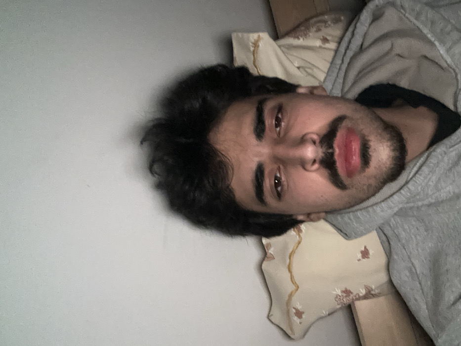The image depicts a male individual indoors in Guimarães, Portugal. The subject possesses dark, wavy hair, a prominent dark mustache, and a short beard. His lips are notably full. He is dressed in a grey hooded sweatshirt over a dark-colored shirt. The individual is positioned in a reclining posture, facing the camera directly. The background features a plain light-colored wall. To the left, a patterned pillow with beige and brown floral designs is visible, resting partially on a wooden bed frame. Another light-colored fabric or pillow is partially discernible on the right side of the frame. The environment is dimly lit, consistent with an interior setting.