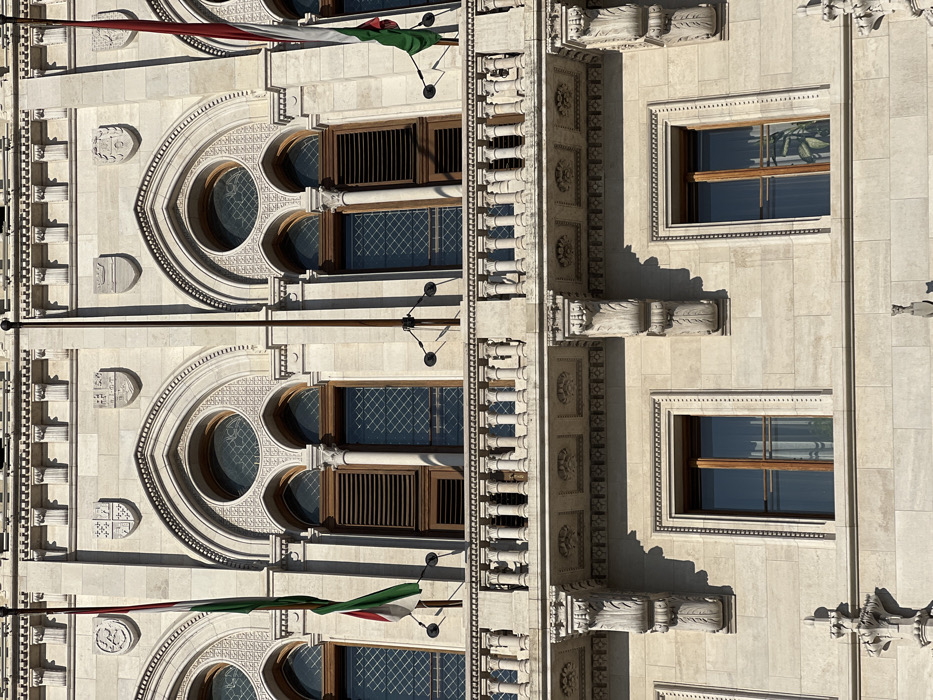 - "The image displays a detailed section of the exterior facade of the Hungarian Parliament Building in Budapest, Hungary, constructed from light-colored stone in a Neo-Gothic architectural style" by FM-oJePr1, licensed under CC BY 4.0