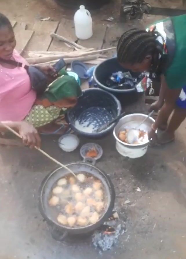 A high-angle shot shows two African women preparing food outside. A woman in a pink shirt sits on the ground, using a long stick to turn round, golden-brown balls frying in a black pot over a wood fire. Beside her is a second woman wearing a green shirt and blue shorts. She stands, using a slotted spoon to transfer freshly-fried balls from another metal pot into a metal colander. A black bucket contains wrappers and other waste, and a second black bucket contains leftover batter. A small white bowl contains a white sauce, and a small brown bowl contains red spices. A white plastic jug sits on a nearby wooden surface. A black barrel is in the background.
