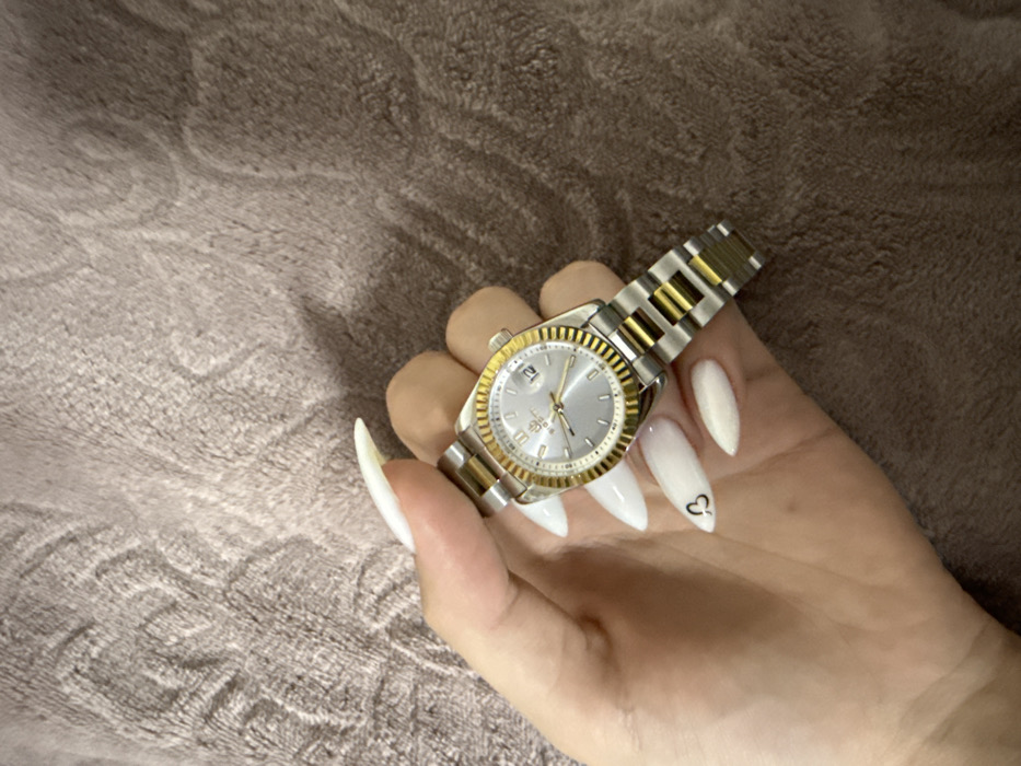 In Voluyak, Bulgaria, a human left hand with light skin tone is observed holding a BIYOT brand wrist watch against a soft, textured, light brown fabric background. The hand displays five elongated, pointed fingernails painted white; the nail on the ring finger features a small black heart emblem. The watch is two-tone, featuring a silver-tone case and outer bracelet links, contrasted with a gold-tone fluted bezel, gold-tone hour markers and hands on a silver dial, and gold-tone inner bracelet links. A date window at the 3 o'clock position shows the numeral "12". The hand is positioned centrally, holding the watch face-up, with the thumb appearing on the left side of the watch and fingers curled around the opposite side.