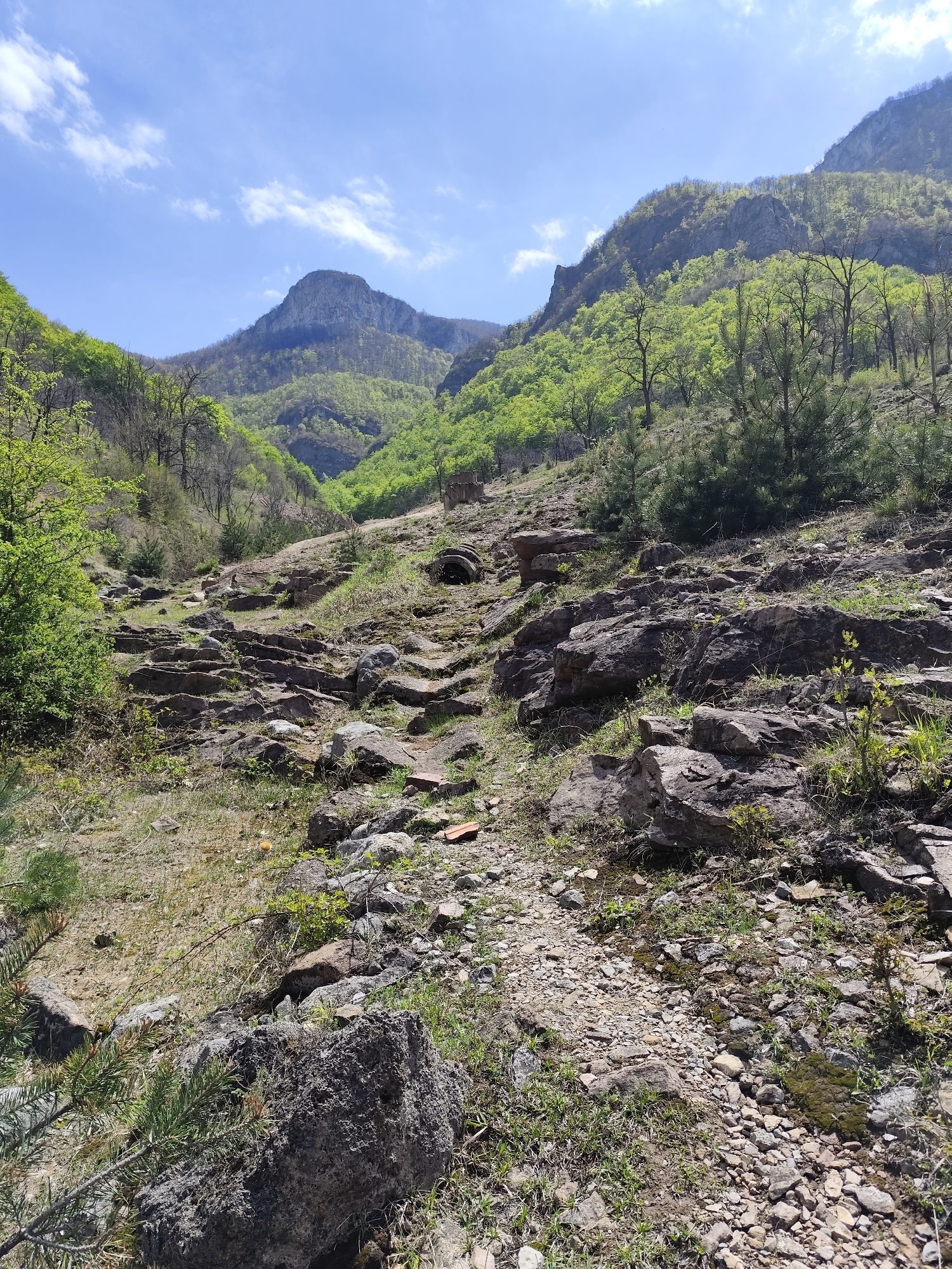The image depicts a rocky landscape leading uphill towards a mountain range, possibly located in the city of Vratsa, Bulgaria