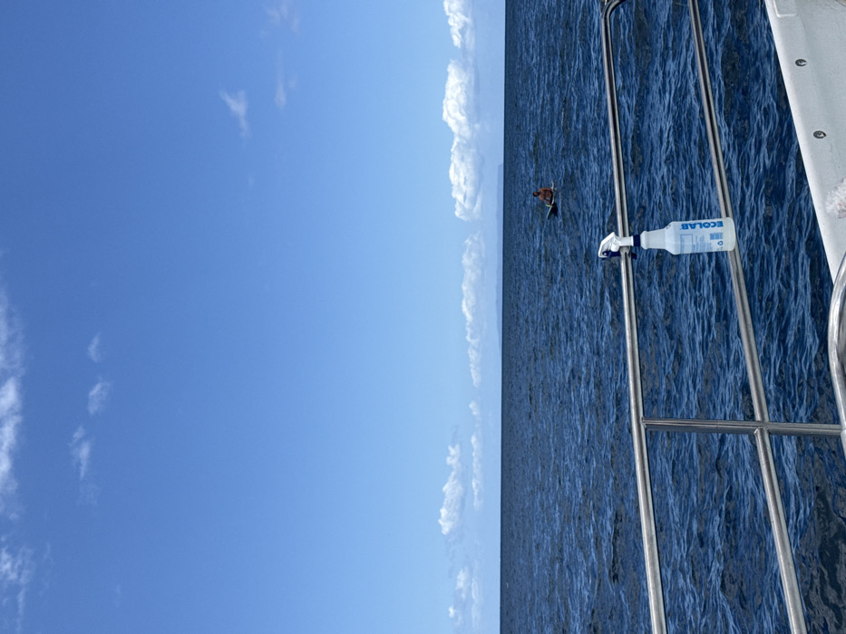 The image displays an expansive view of the open ocean under a bright blue sky, likely in the waters off Kaumakani, United States. In the foreground, a silver metal boat railing extends horizontally, from which a white plastic spray bottle, labeled "ECOLAB," hangs clipped. The ocean surface is dark blue with visible ripples. In the midground, a lone individual, appearing shirtless, sits on a dark-colored surfboard or paddleboard. The person is positioned facing generally away from the camera. On the distant horizon, a low-lying landmass or island is visible. The sky above is clear blue with scattered white cumulus clouds, concentrated more densely towards the horizon. The scene indicates fair weather conditions.
