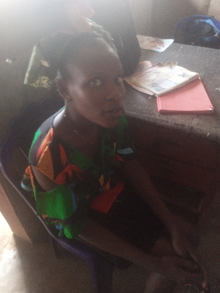 A person sits at a desk with notebooks. They wear a vibrant patterned top with green, yellow, and red hues. The desk surface appears worn and is cluttered with school supplies. A blue backpack rests in the background. The lighting is uneven, casting shadows across the scene, particularly in the lower half of the image.