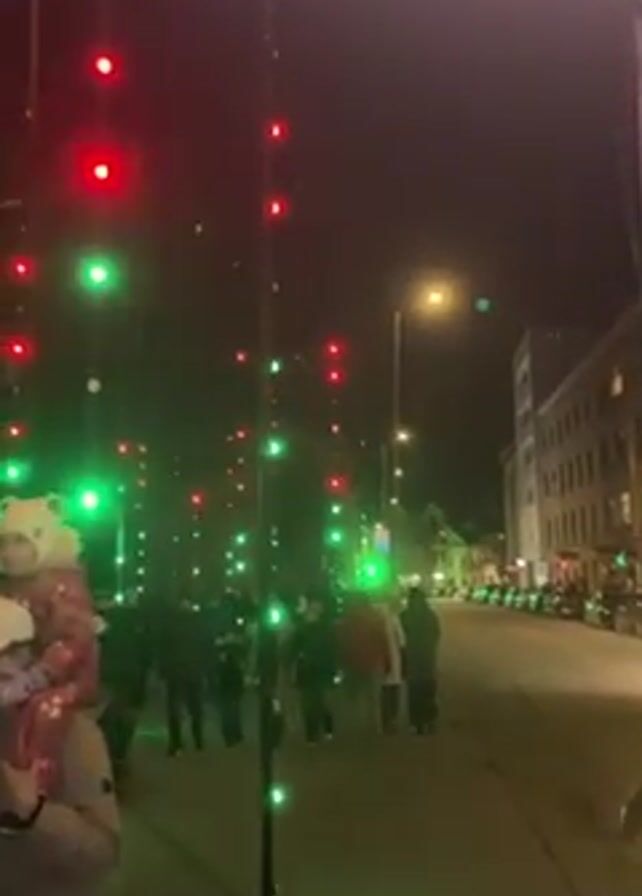 At night, people are walking on a sidewalk past vertical structures with red and green lights. A street runs parallel to the sidewalk, and buildings are visible in the background. One person is carrying a small child on their shoulders. The lights seem to be positioned like trees, creating an illuminated walkway.