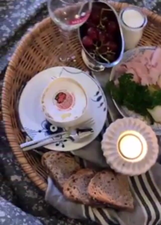 A high-angle, static shot shows a wicker tray on a floral-patterned bedspread. The tray holds a gourmet breakfast or snack: brie cheese, dark bread slices, grapes, ham, pears, and a small pitcher of cream. A lit candle adds ambiance. A bottle of Royal Guillem sparkling wine sits beside the tray. A baby monitor and a remote control are also visible on the bed. A Pembroke Welsh Corgi with a smiling expression appears at the edge of the bed, gazing at the camera.