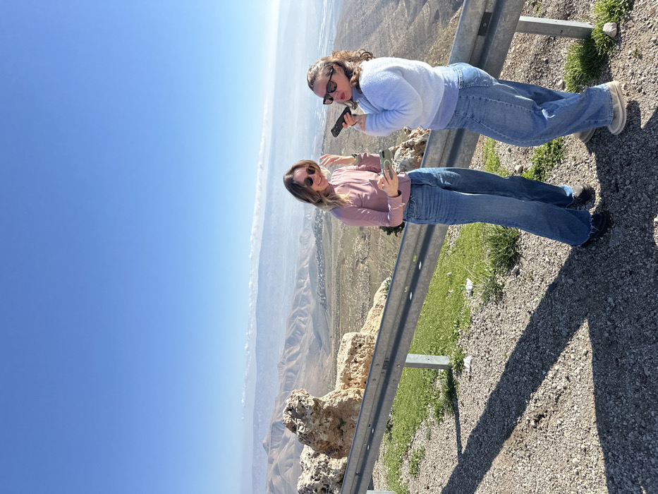 Two adult females are positioned on a gravel path beside a metal guardrail, overlooking a vast, arid, mountainous landscape in the region of Unknown, Palestinian Territory, under a clear blue sky