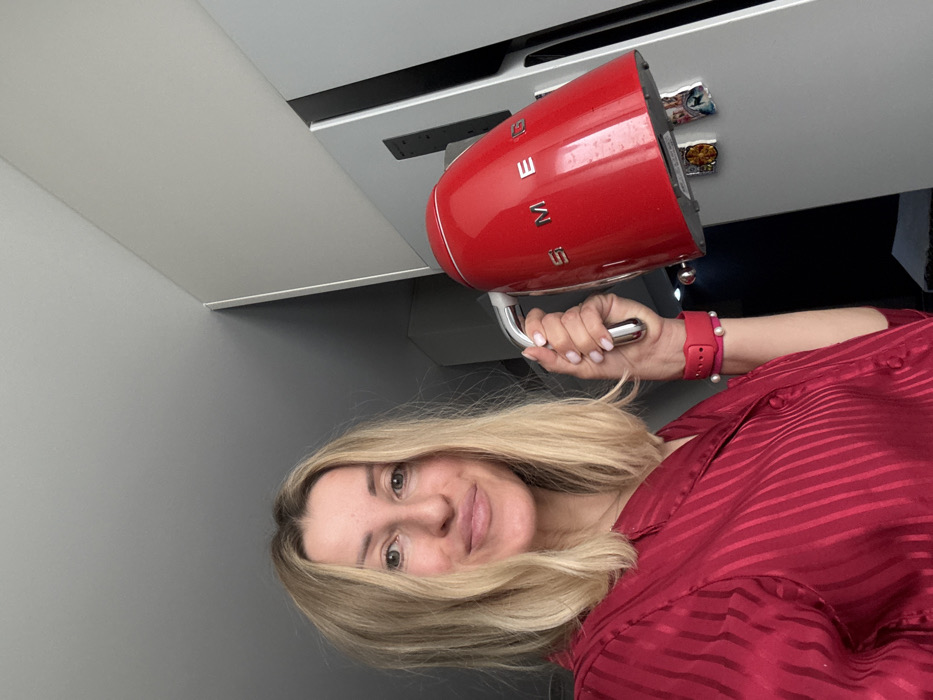 An adult female is depicted in an indoor kitchen environment. She has shoulder-length blonde hair and a fair complexion, and is looking directly at the camera with a slight smile. She wears a deep red, vertically striped, long-sleeved top. On her left wrist, a red smart watch with a white band is present, alongside a bracelet composed of white pearls. Her right hand grips the chrome handle of a red SMEG electric kettle, positioned centrally. To the right of the woman, a light grey refrigerator is visible, featuring several small, colorful decorative magnets or stickers. The background includes a grey wall, a white ceiling, and a white overhead cabinet or soffit. The specific location within València, Spain, is not discernible from the visual evidence in the image.