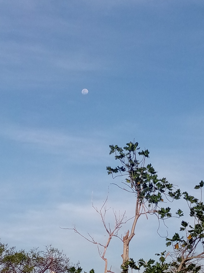 This image depicts a daytime outdoor scene in San Juan Bautista, Venezuela, focused on the sky and tree canopy. The upper portion of the frame features a clear, light blue sky with faint, wispy white cloud formations. A distinct, white moon is visible in the upper-left quadrant of the sky. The lower section of the image displays the upper branches and foliage of several trees. A prominent tree in the mid-right exhibits both green, lobed leaves on some branches and bare or sparsely foliated light-brown branches. To its left, a separate tree with numerous bare, thin, light-brown branches is partially visible. Additional green tree tops are present along the bottom edge of the frame.