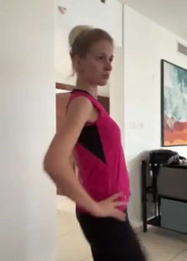 A woman with blonde hair pulled up in a bun is standing in a well-lit room. She wears a pink athletic top and black leggings. She is demonstrating a series of leg exercises. First, she lifts her knee to her chest, then she steps into a lunge with her arms raised overhead. Next, she returns to lifting her knee to her chest, this time holding her knee in place with her hands. The room is white with light-colored tile flooring. In the background, there is a painting on the wall, a small black table with some items on it, and a doorway.