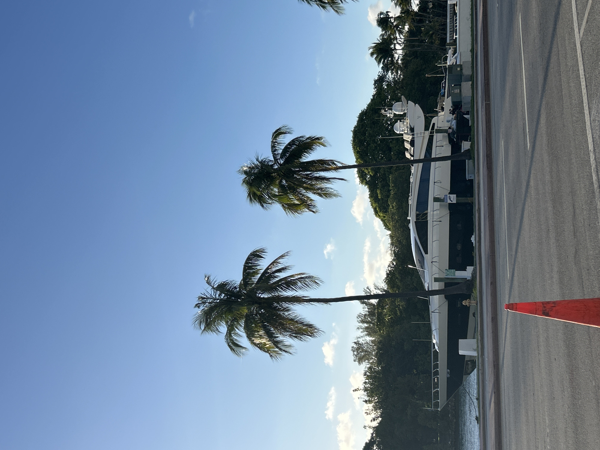The image captures a marina in Miami Beach, Florida, featuring two prominent palm trees in the foreground against a clear blue sky