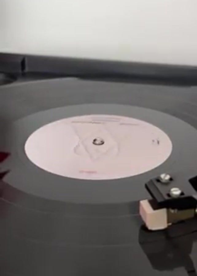 A close-up shot shows a black vinyl record spinning on a turntable. The record label is light pink with a design that includes a triangle and other abstract shapes in white. The needle of the turntable is positioned to play the record. The turntable is black and appears to be sitting on a flat surface, with a white wall or background visible behind it. The lighting is soft and even, illuminating the scene without harsh shadows. The video focuses primarily on the record and the turntable's needle.