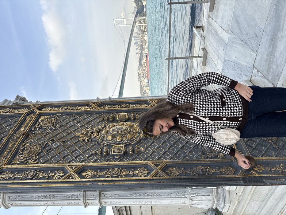 A female subject stands on a light-colored tiled waterfront promenade in Üsküdar, Turkey, positioned to the right of an ornate, dark metal gate embellished with gold geometric and floral patterns, featuring a central oval medallion and a heavy decorative handle