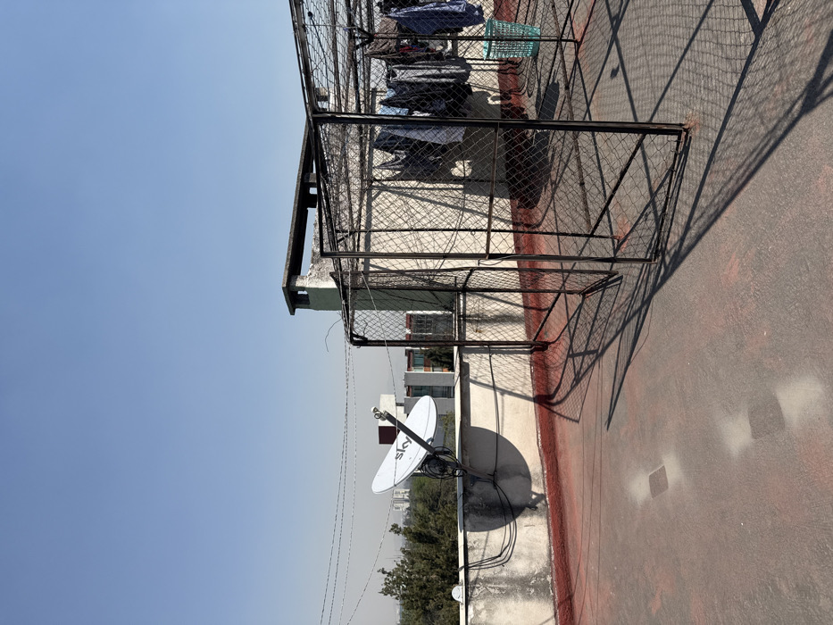 A rooftop setting includes a satellite dish affixed to a red-lined structure. A metal mesh cage or enclosure stretches across the upper portion, casting a shadow across the roof. Clothes hang within the caged area. A clear blue sky fills the background above surrounding buildings and distant trees.