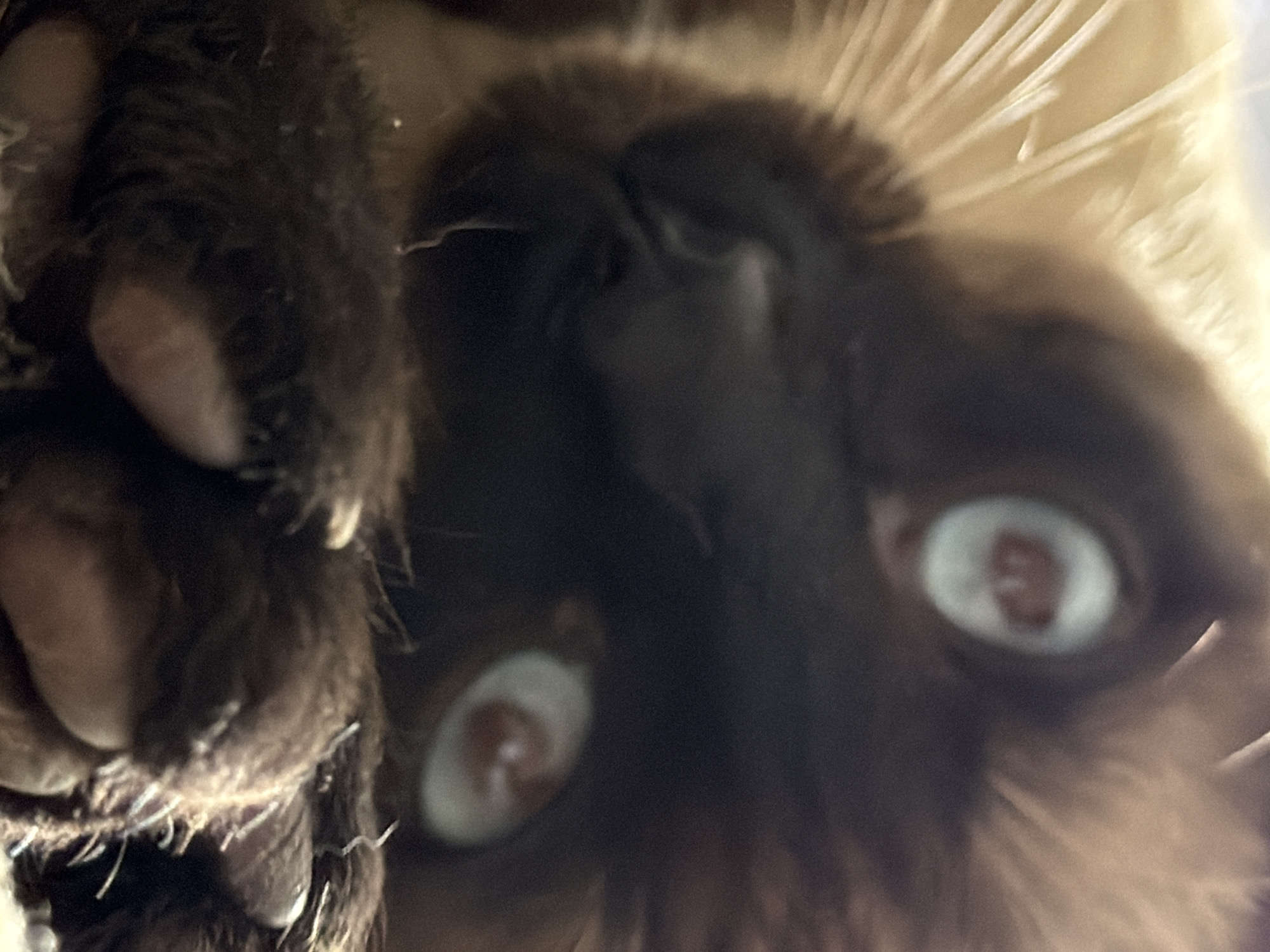 close-up of a Siamese cat's face and paws. The cat's eyes are wide and slightly unfocused. The paws, with visible claws, are positioned near the face. The background is blurred, but some light-colored fur is visible. There is no indication of the location being Esch-sur-Alzette, Luxembourg or any other location. No people are visible in the image.