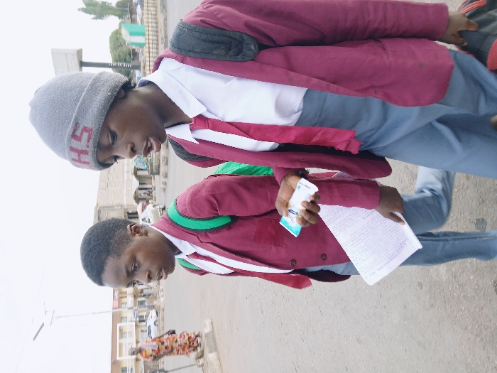 Two young individuals stand close to each other outdoors, likely students due to their school-like attire. Both are wearing what appears to be maroon jackets and blue trousers. One wears a gray beanie with text on it. The other holds a sheet of paper and a small box of medication. They seem to be engaged in a conversation, perhaps related to the contents they are carrying. The background shows an urban scene with buildings, a streetlight, and a pedestrian crossing.