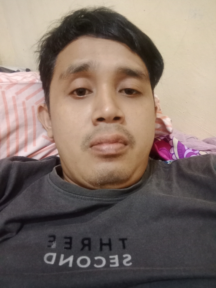 A male individual is depicted in a close-up, frontal portrait, likely a selfie, taken indoors. He has dark hair, dark eyes, a light mustache, and stubble on his chin, looking directly into the camera with a neutral expression and slightly parted lips. He is wearing a dark grey short-sleeved t-shirt with reversed text on the front that reads "SECOND THREE". To the left of the individual, a pillow with pink and white stripes is visible. To the right, another fabric object, possibly a pillow or blanket, features purple, pink, and white patterns. The background wall is a solid, light beige color. The scene is situated in Brangsong, Indonesia.