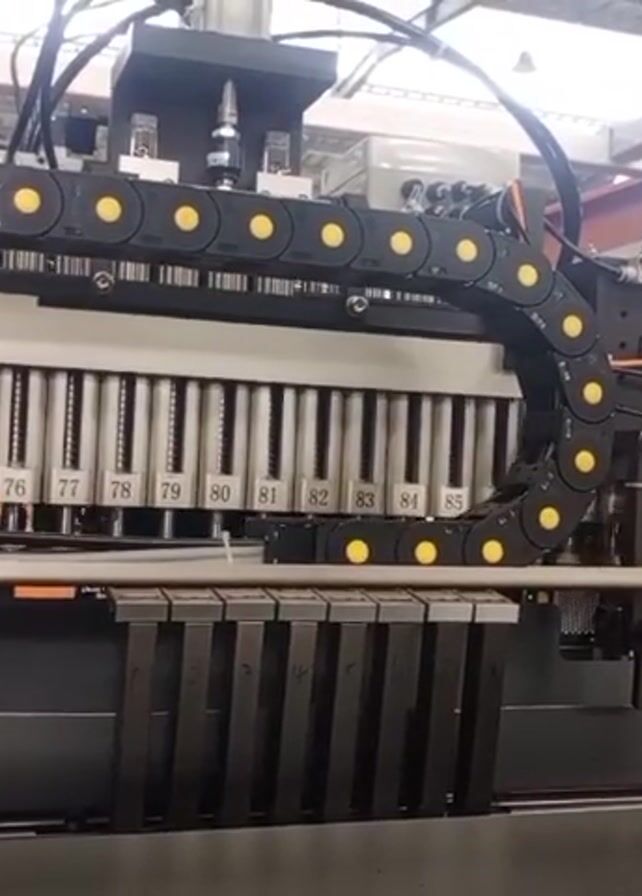 n industrial machine in operation. The machine has a linear array of numbered vertical posts labeled 72 through 100, and a black plastic chain with yellow circles on it runs along the top of the machine. Below the posts are black vertical bars. Wires and tubes are visible throughout the machine. In the background, a conveyor belt can be seen, and other industrial structures suggest this is a manufacturing or processing facility. The video is taken with a TECNO CAMON 20 phone.