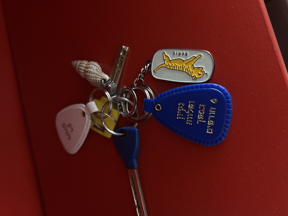 A set of keys with various keychains lies on a red surface. The keychains include a white heart-shaped keychain with Hebrew lettering, a yellow circular keychain, a blue triangular keychain with Hebrew lettering, and a silver rectangular keychain with a yellow tiger silhouette and the word "Boris" written on it. The keychains are attached to a silver chain. A seashell is also attached to the key chain. The coordinates provided correspond to a location in the Neve Tzedek neighborhood of Tel Aviv-Yafo, Israel.