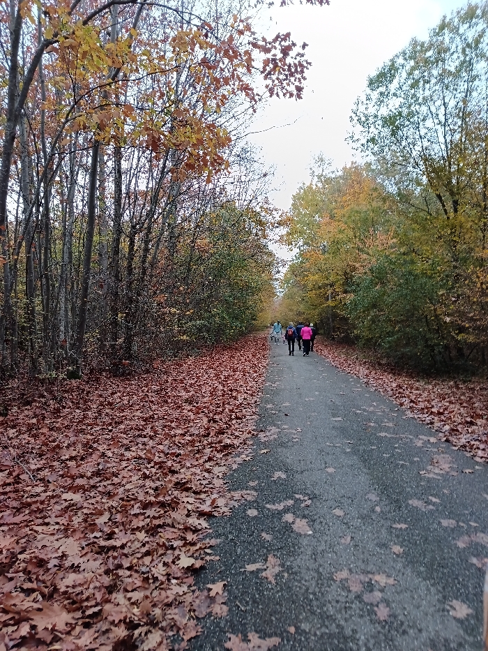 This image depicts an autumn scene on a paved path within a wooded area in Brumath, France. The path, dark gray and slightly damp, extends into the distance, with scattered brown-orange leaves on its surface. On both sides, deciduous trees line the path; those on the left exhibit mostly bare branches with some remaining rust-colored foliage, while trees on the right display a mix of green, yellow, and orange leaves. The ground adjacent to the path is densely covered with fallen, dry, brown-orange leaves. In the mid-ground, a group of approximately 6-8 individuals is walking away from the viewer along the path. They are dressed in outdoor clothing, with visible colors including light blue, dark blue, purple, and bright pink outerwear. The sky above is overcast and light gray.