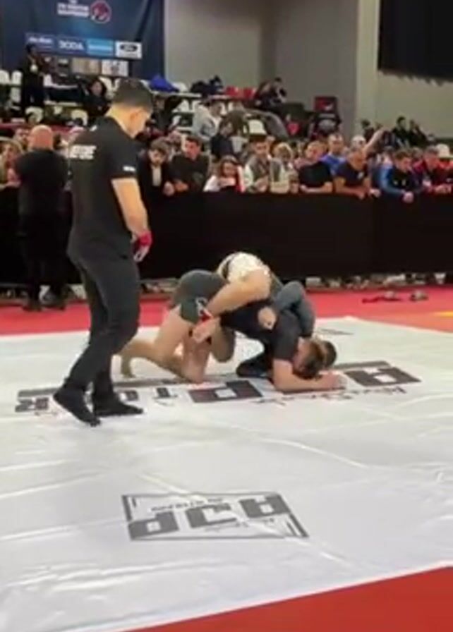 In a wrestling match, two contestants are grappling on a red and white mat. The contestant in a dark shirt has the other contestant pinned on their back. The pinned wrestler is wearing white shorts with a dark pattern. A referee in a black shirt and pants is watching closely. In the background, there is a crowd of people observing the match. A banner hangs in the background displaying the event's name.