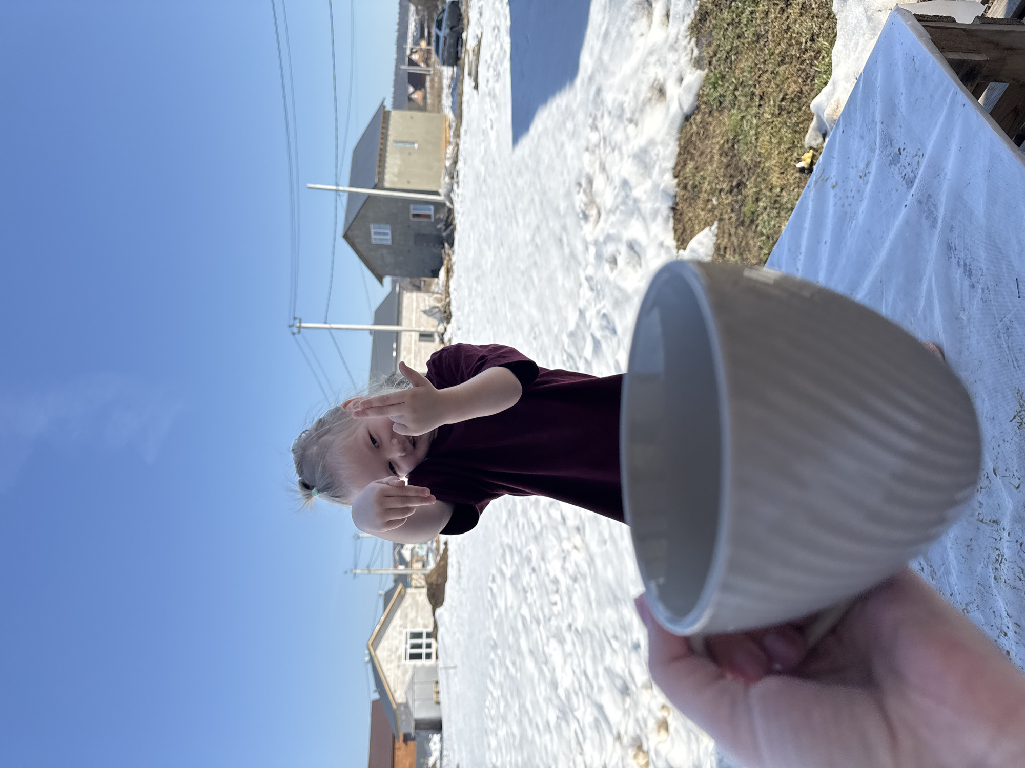 A low-angle, outdoor shot shows a young girl with blonde hair partially obscuring her face, making the "loser" sign, in front of a neighborhood covered in snow on a sunny day. She is wearing a maroon shirt. A person's hand in the foreground is holding a ceramic mug, further obscuring the view. The background features residential buildings, power lines, snow-covered ground, and patches of dry grass. The location is likely in the city of Gornyi, Dvurechenskoe S/P, Russia, as specified.