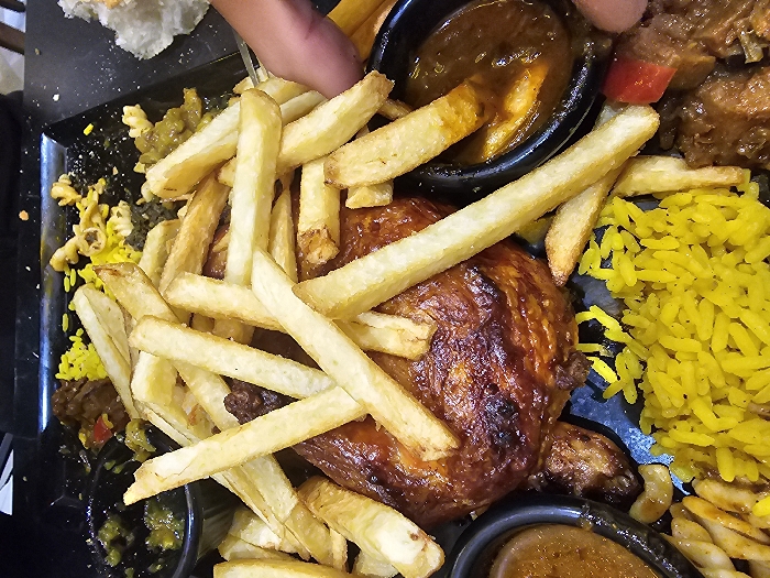 A black tray holds a feast of food. A roasted chicken is at the center, smothered in golden-brown french fries. Bright yellow rice sits to the right, while two small black bowls of sauce flank the chicken. Other items include macaroni and cheese, diced vegetables, and what looks to be meat. A partial view of a hand appears to be reaching for the food.