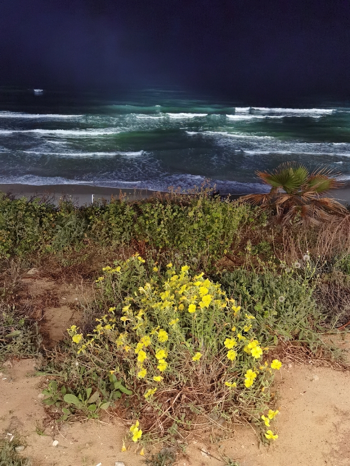 This is a nocturnal, elevated view of the Mediterranean coastline in Bat Yam, Israel. The dark sky extends over dark teal-green sea water, where multiple lines of white-capped waves break towards the shore. A narrow strip of dark sand beach separates the water from the vegetated cliff. The immediate foreground shows sandy earth with a central, dense bush of bright yellow flowers, surrounded by various green and dried plants. A small palm tree with dark green fronds is visible on the right, situated between the upper vegetation and the beach level. No human activity or man-made structures are discernible on the beach or in the water.