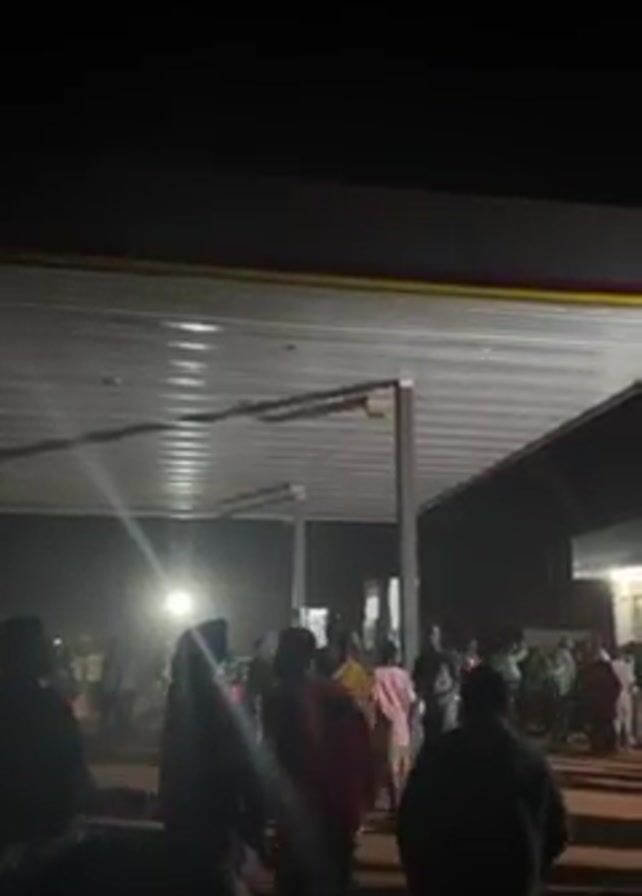 group of people congregated under the canopy of what appears to be a gas station at night. A bright light shines from the left side of the frame, illuminating the underside of the canopy and the crowd. There is movement within the crowd, and some figures appear to be raising their arms. Sounds of yelling or shouting can be heard. The overall atmosphere seems chaotic and possibly confrontational.