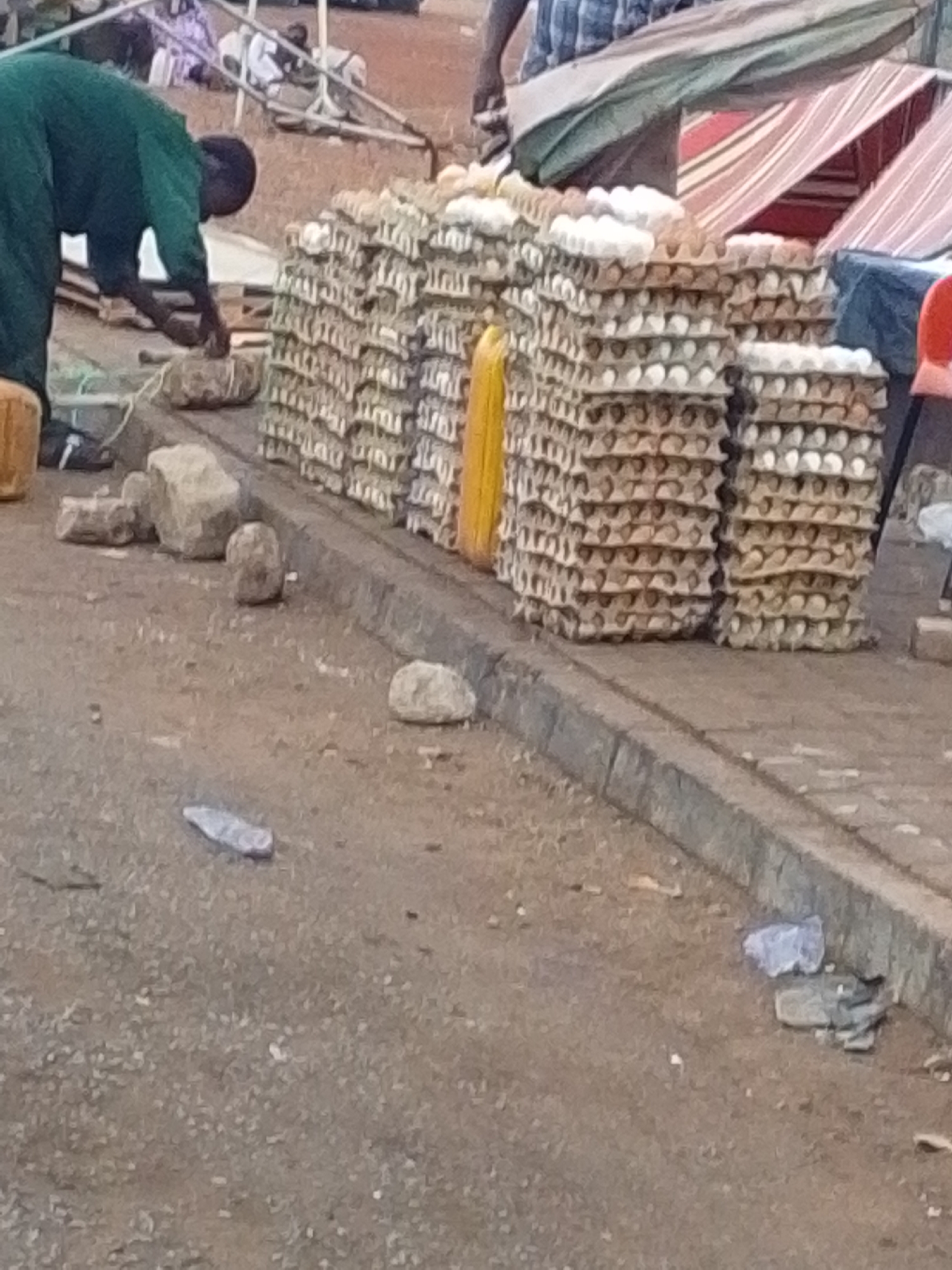 The scene captures a street-side vending operation, likely in Tamale, Ghana. A man dressed in a green outfit is stooped over, seemingly occupied with arranging or preparing materials. Several stacks of egg cartons, filled with white eggs, are placed along the edge of the pavement, indicating this is a point of sale. The immediate environment consists of a worn pavement surface with scattered debris, including rocks, stones, and plastic waste. A yellow object and a red chair are also visible near the egg cartons. In the background, there are suggestions of market stalls with striped awnings and other individuals engaged in various activities.