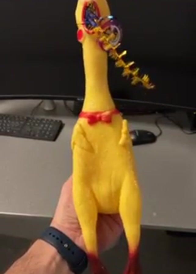 A hand holds a yellow, rubber chicken toy that emits a loud squawk when squeezed