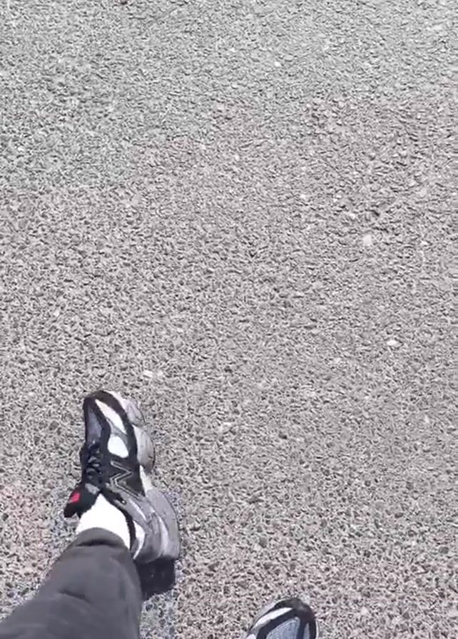 person walking on a paved surface and stopping in front of a gray Ferrari SF90 parked in front of a mall