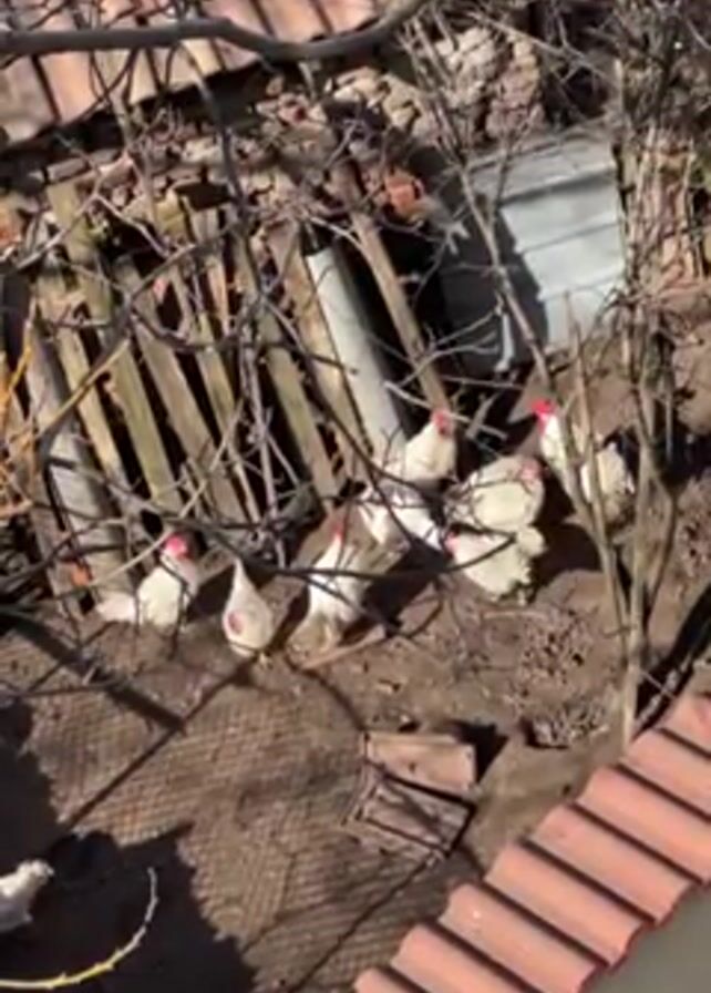 group of white chickens in a dirt enclosure, viewed from above, possibly from a rooftop. The chickens are visible amongst scattered branches and a partially dilapidated wooden fence. A metal container is situated against the fence. The roof from which the video is recorded is covered in red tiles. The scene is bathed in sunlight, casting shadows throughout.