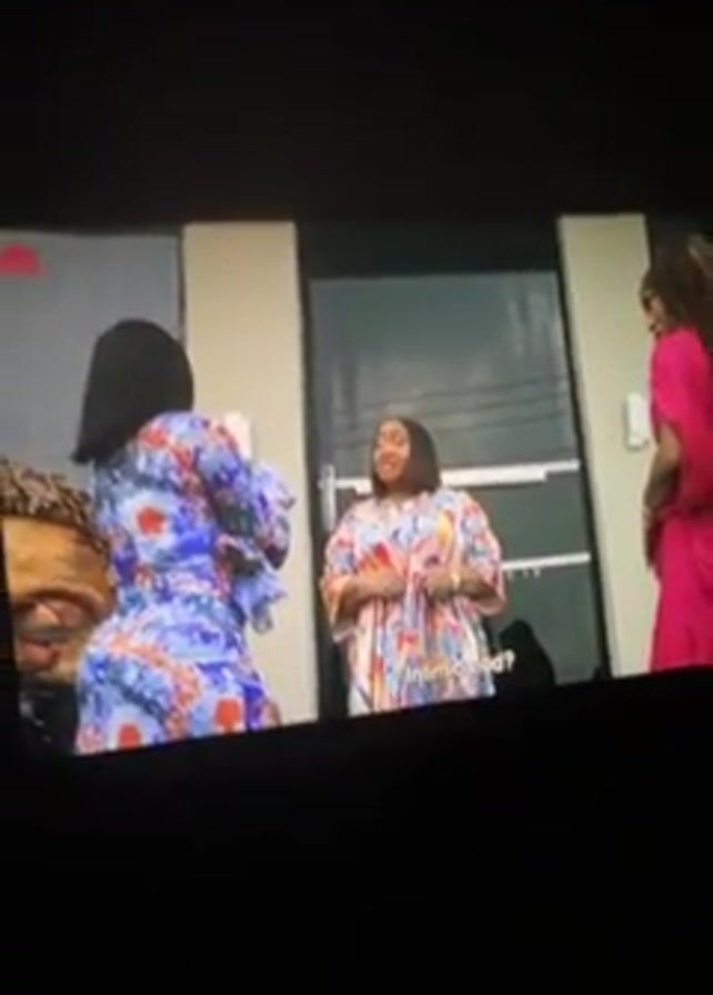 dark scene of a woman in a colorful shirt saying "Intimidated? By a wandering goat in the lion's den?" Two women stand to her side in the background. The scene is likely from a film or television show.