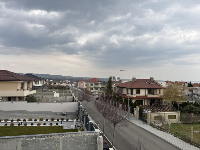 The image presents an elevated panoramic view of a residential area in Burgas, Bulgaria, under an overcast sky