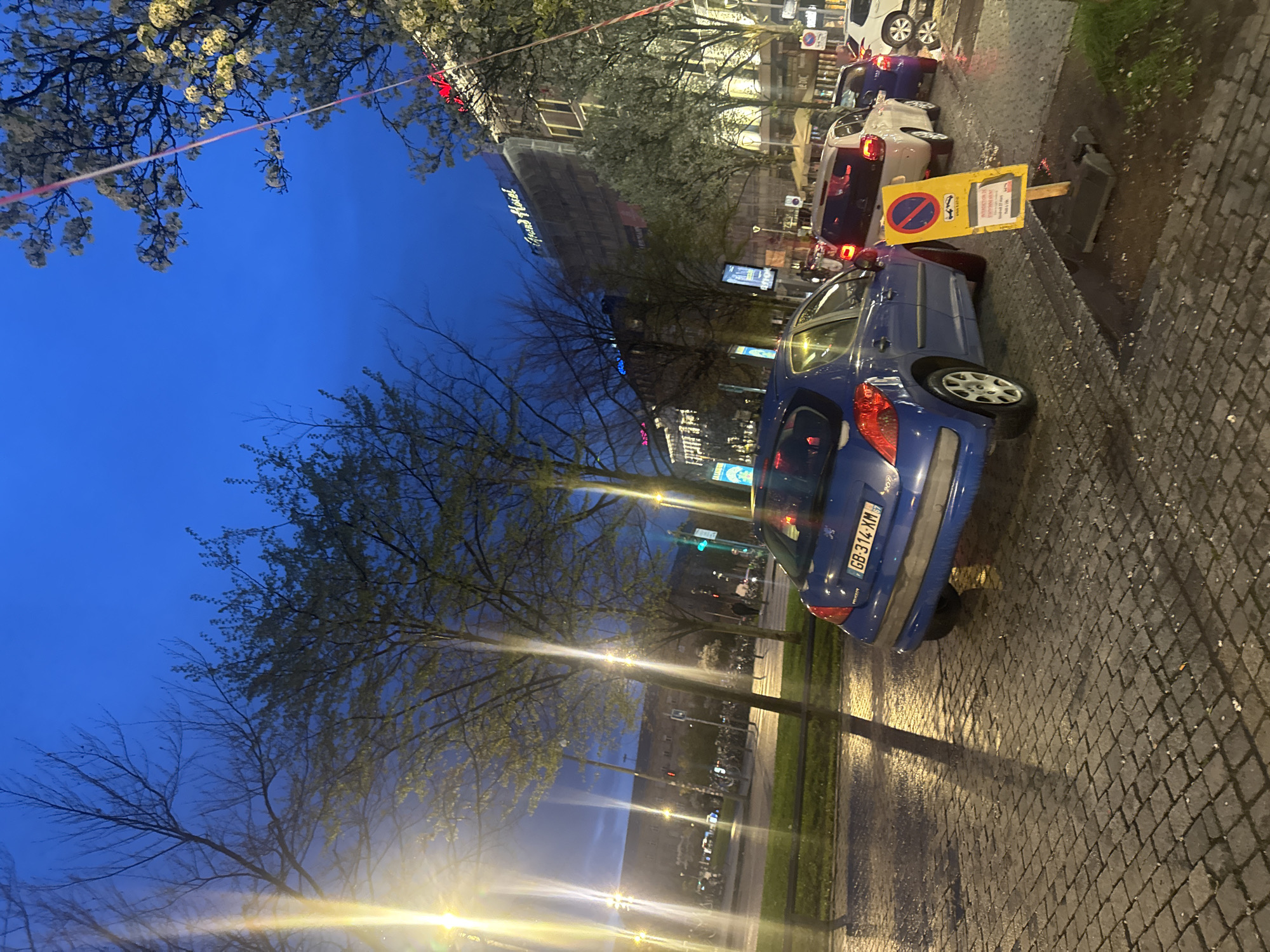 The scene depicts a city street at twilight or early night, specifically in Strasbourg, France, near the Grand Hotel. The ground consists of wet cobblestone pavement transitioning to a wet asphalt street, illuminated by artificial streetlights and vehicle lights. In the foreground, a blue Peugeot 207 hatchback (French license plate GB-314-XM) is positioned partially on the cobblestone sidewalk and partially on the street. To its right, a yellow temporary sign with a red circular 'no parking' symbol is planted in the ground, displaying French text that reads: "INTERDICTION DE STATIONNEMENT / Vendredi 23 mars / de 6h à 19h" (No Parking / Friday March 23 / from 6 am to 7 pm). A queue of vehicles, including a white hatchback, a dark blue hatchback, and a white SUV, is stopped on the street behind the blue Peugeot. Bare trees, trees with nascent green foliage, and a tree adorned with white blossoms line the street. In the midground, a prominent multi-story building displays an illuminated "Grand Hotel" sign on its upper facade. Other illuminated buildings and street furniture are visible under a dark blue sky. No individuals are distinctly visible.