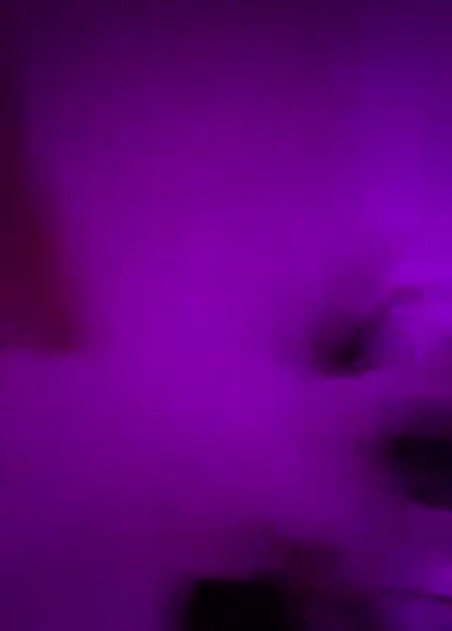 A person in a pink top and patterned pants is taking a selfie in a room lit with purple light. They are wearing glasses and have their hair pulled back. The room has a plant, a refrigerator, and string lights. The video is shaky and out of focus at times.