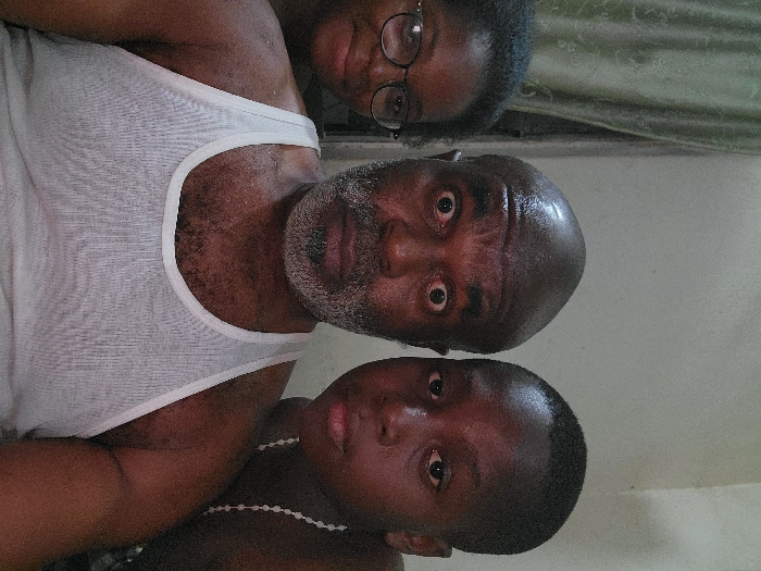 The scene, located indoors in Sabon Tasha, Nigeria, depicts three individuals in a close-up portrait. A dark-skinned adult male occupies the central foreground, presenting a bald, visibly moist scalp and a gray beard, wearing a white ribbed tank top. His eyes are wide open, directed toward the camera in an exaggerated expression. To his immediate left, partially visible, is a dark-skinned female, likely a juvenile, with eyeglasses and dark curly hair, exhibiting a subtle smile. To his immediate right, also partially visible, is a dark-skinned male, likely a juvenile, with short dark hair and wearing a light-colored beaded necklace, maintaining a neutral facial expression. The background consists of a patterned light-colored curtain on the left and a plain light-colored wall on the right, consistent with an interior residential setting under ambient lighting conditions.