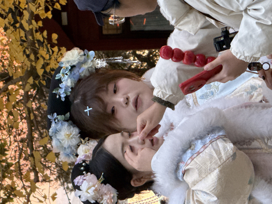 The scene, set in Xicheng District, China, depicts three females outdoors, partially obscured by each other. The background features blurred golden-yellow ginkgo leaves and a reddish-brown architectural element. In the foreground, a female on the left, viewed from the upper torso, wears traditional Chinese attire. Her garment is light-colored (beige/gold) with a light blue patterned underlayer featuring motifs such as butterflies, and is trimmed with white fur. Her dark hair is styled in an updo, adorned with a hairpiece featuring pink and white flowers. Her left eye is closed while her right eye is partially visible; her nose area is being manipulated. A second female, positioned centrally and slightly behind the first, uses her right hand to touch the nose/eye region of the leftmost female, indicating an adjustment or application. This second female has light brown hair with bangs and a white "plus sign" hair clip. She wears a large, elaborate black headpiece decorated with blue and white flowers and multiple silver-toned dangling elements. Her clothing also appears to be traditional, with white fur trim visible. On the far right, a third female, partially visible from the side, wears a dark baseball cap and glasses with round frames. She holds a red smartphone in her left hand, directed towards the other two individuals. In her right hand, she holds a skewer containing five red candied hawthorns (tanghulu). A small black device, possibly a camera accessory or microphone, is visible near her right hand.