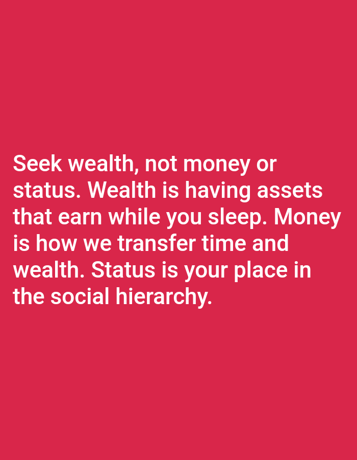 The image contains a text quote on a solid crimson red background. The quote reads, "Seek wealth, not money or status. Wealth is having assets that earn while you sleep. Money is how we transfer time and wealth. Status is your place in the social hierarchy." The coordinates 39.165, -85.739 locate the image in Columbus, Ohio, USA. No people or other subjects are present.