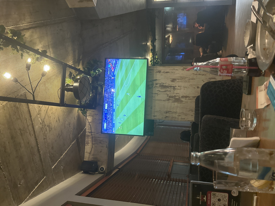 The image depicts an interior scene within an establishment located in Haskovo, Bulgaria, likely a café or lounge. The environment features an exposed concrete ceiling with visible formwork lines. Mounted centrally is a rectangular black metal mesh light fixture adorned with artificial green foliage, containing multiple exposed incandescent bulbs and a larger black industrial-style dome light with a protective cage. To the left, a black speaker is mounted on a concrete beam, beneath which a small security camera is visible. Walls exhibit a distressed, textured finish, appearing as aged concrete or plaster. Horizontal wooden blinds cover windows or wall sections to the left and rear right. In the foreground, a wooden table displays various items: a clear glass bottle of DEVIN-brand water, a clear glass tumbler with yellow liquid residue, a crumpled light blue cigarette pack, a crumpled 10 Euro banknote, a dark smartphone placed face down, a clear glass ashtray containing a white cigarette butt, a red Coca-Cola glass bottle with a clear plastic straw and dark liquid, a light-colored plate with food remnants and two metal utensils (fork and spoon), and a white napkin dispenser. A black menu stand with a QR code and text "OPEN MINDS" is also visible on the table's left edge. Centrally positioned, a large flat-screen television is mounted on the wall, displaying a live football (soccer) match. The screen shows a green field with players in blue and white kits. Scores "85:52" and "1:0" are visible at the top, along with advertisements for "BTC" and "crypto.com" at the bottom. In the mid-ground, multiple dark, upholstered chairs or low sofas with a textured pattern are arranged. In the background, to the right, three individuals are visible within a seating area composed of darker armchairs or sofas. Their features are indistinct due to distance and lighting. One person is mostly obscured by a chair, facing away, while two others are seated further back. No specific actions or interactions beyond sitting are clearly discernible. The overall lighting is artificial and relatively dim.